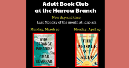 4 hours ago 0 commentsThe Harrow Branch is switching things up! The Adult Book Club has a new day and time. It will now be scheduled for the last Monday of the month at 10:30 am. If you like to read and discuss books, then join us! Register on the Event Calendar online at […]