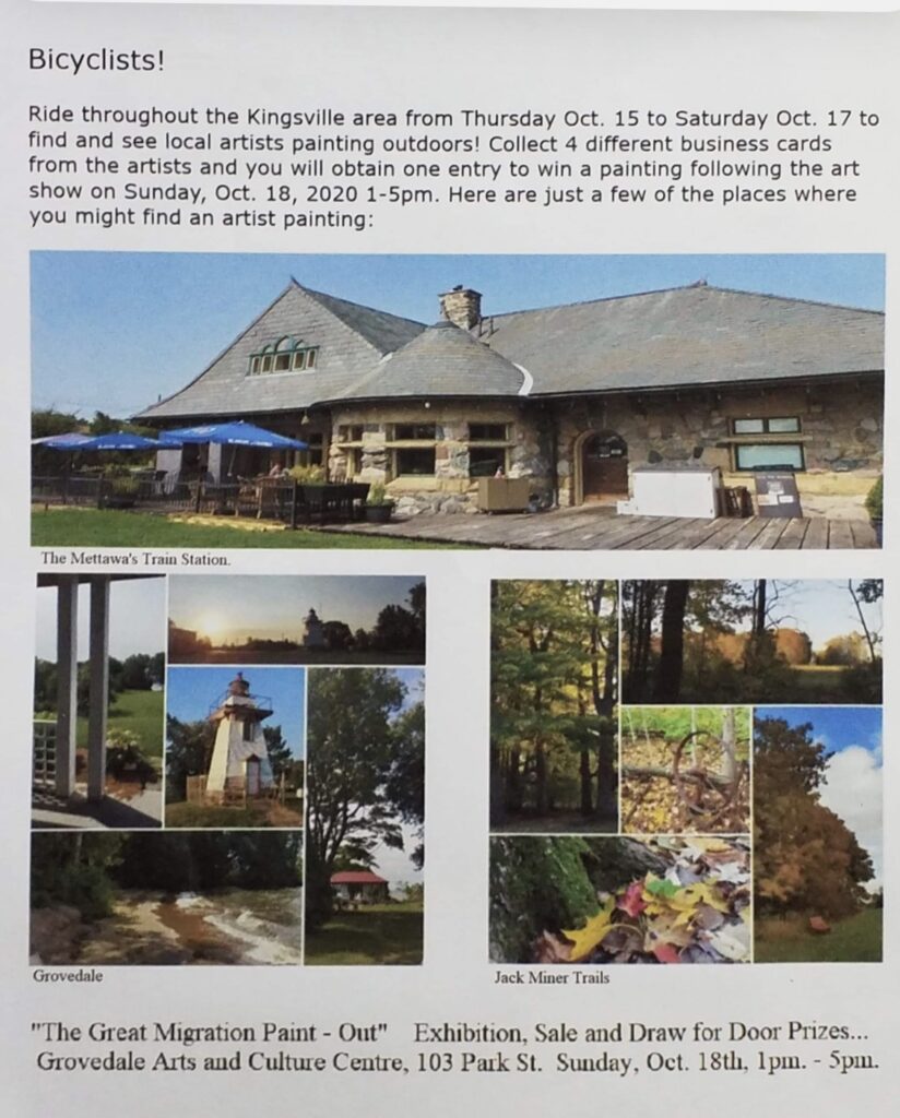 Here’s an update for bike-riders to take part in a special scavenger hunt this weekend. Try to find the artists around town as they participate in the Great Migration Paint Out! Everything will be happening within the boundaries of the municipality of Kingsville — Albuna Road to the Arner Town Line, from Lake Erie to Road 8.