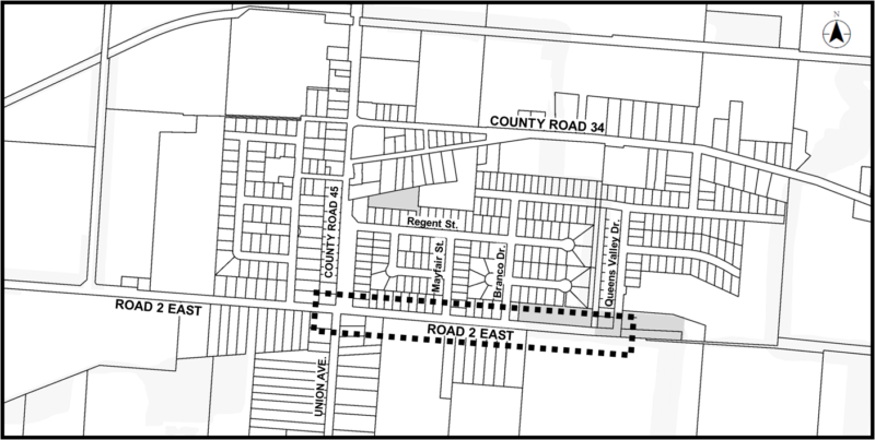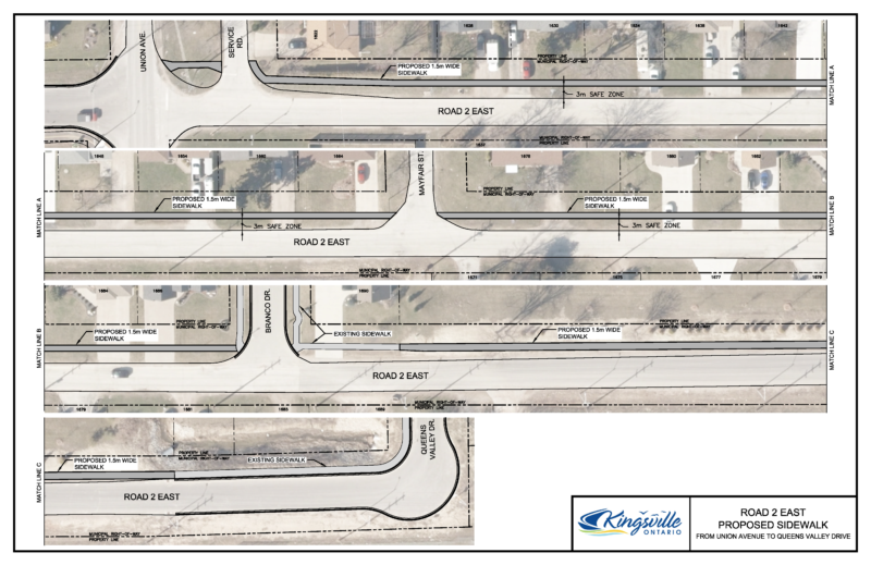 The Town of Kingsville (Town) is seeking public feedback on a proposed sidewalk along Road 2 East. The sidewalk would be installed on the north side of Road 2 East and connect the new subdivision at Queens Valley Drive to Union Avenue.