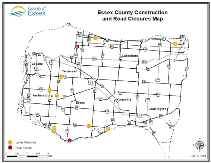 County Road 42 will be closed in both directions with local access only to residents and businesses beginning June 17 from County Road 43 (Banwell Road) to Lauzon Road. The full closure is expected to last about three months. All businesses remain open during construction. (Map ID#11)