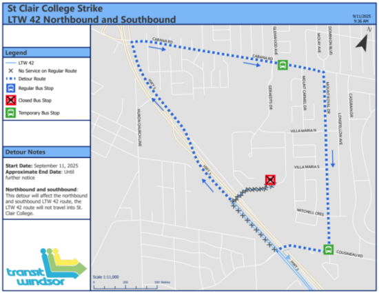 The Municipality of Leamington advises that due to ongoing strike action at the St. Clair College campus, LTW (Leamington to Windsor) Transit buses, operated by Transit Windsor, will not be entering St. Clair College property until further notice.