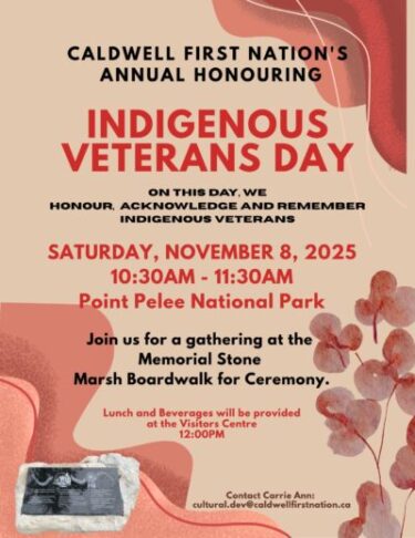 Caldwell First Nation will be holding an Indigenous Veterans Day ceremony in Point Pelee National Park on November 8, 2025 starting at 10:30 am.