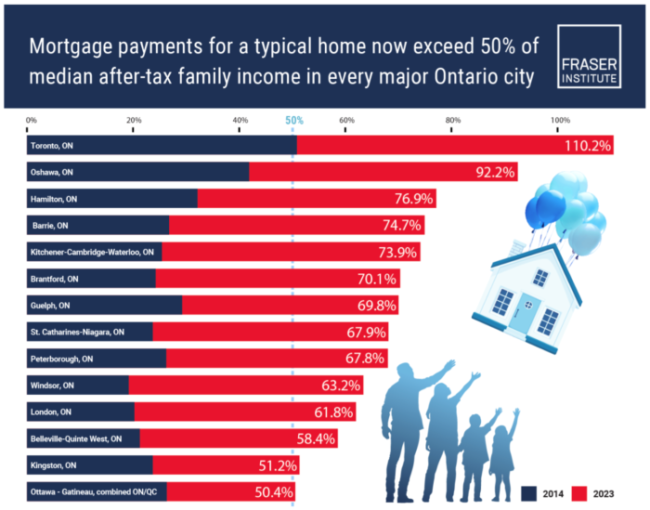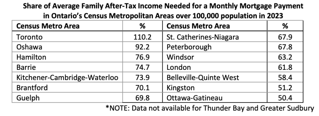 Mortgage payments for typical home now exceeds 50% of after-tax family income in every Ontario urban centre; 110% in Toronto