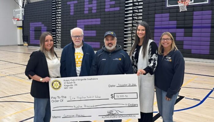 Rotary Club of Kingsville Southshore has made a significant contribution to local students and families. Rotary members visited Erie Migration District School this week to present a $12,000 cheque to the school for the purchase of new bleachers in The DEN — the school’s main gym where assemblies, school spirit events, and sports games bring students, families, and the community together under the proud coyote mascot.