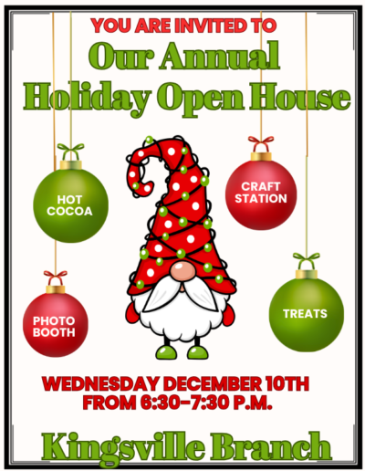 The Kingsville Branch of the Essex County Library is inviting one and all to its Holiday Open House.