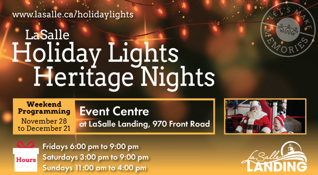 The Town of LaSalle welcomes residents and visitors to the Holiday Lights Heritage Nights festive markets, part of the spectacular season of celebration at the Event Centre at LaSalle Landing, 970 Front Road.