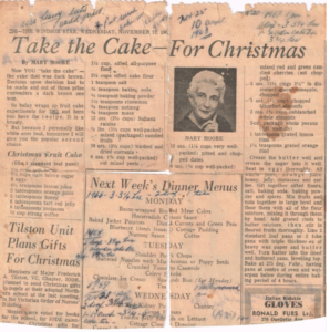 Lois was a great fan of Mary Moore, who wrote a daily recipe column syndicated in newspapers across Canada. Mary Moore’s Christmas Cake recipe from the Windsor Star on November 13, 1963, began Lois’ tradition of baking a fruit cake each fall.