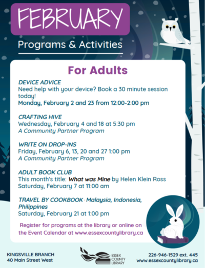 Register online at www.essexcountylibrary.ca or by phoning (226) 946-1529 ext. 445