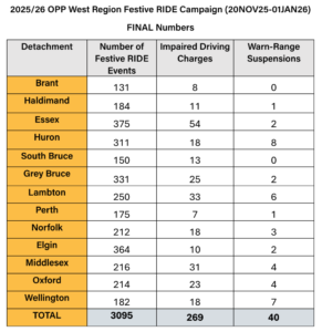 From the start of the campaign on November 20, 2025, until its conclusion on January 1, 2026, Ontario Provincial Police (OPP) West Region officers conducted 3095 Festive RIDE spot checks across 13 detachment areas.