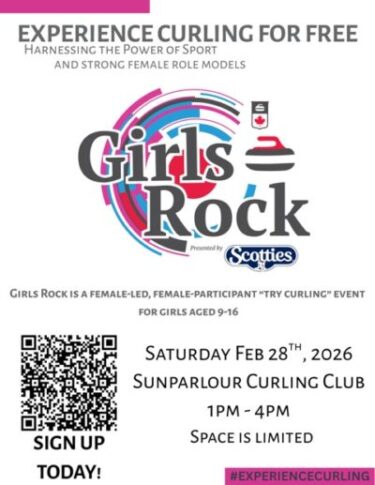 Sun Parlour Curling Club is proud to announce it will host a special Scotties “Girls Rock” Curling Event on Saturday, February 28, 2026, from 1:00 p.m. to 4:00 p.m. at the club, located at 55 Seacliff Drive East, Leamington.