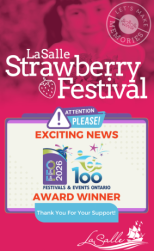 The Town of LaSalle is thrilled to announce that the beloved LaSalle Strawberry Festival has once again earned a spot among the Top 100 Festivals and Events in Ontario in 2025.