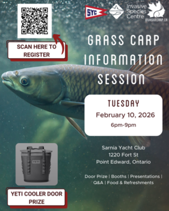 The Invasive Species Centre, through the Invasive Carp Canada program, is hosting a Grass Carp Information Session in Point Edward, ON at the Sarnia Yacht Club on Tuesday, February 10th at 6:00pm. The purpose of the event is to share knowledge and updates on the threats that invasive Grass Carp pose to Canadian waters and to invite discussion with experts on the issue.