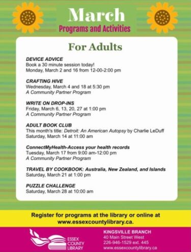 Register online at www.essexcountylibrary.ca or by phoning (226) 946-1529 ext. 445