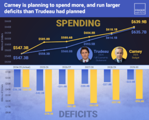 Prime Minister Mark Carney’s 2025 budget, his first in office, forecasts total federal program spending over the next four years will be $67.6 billion higher than what was planned by former Prime Minister Justin Trudeau, and his expected deficits are double the Trudeau government’s projections, finds a new study published today by the Fraser Institute, an independent, non-partisan Canadian public policy think-tank.
