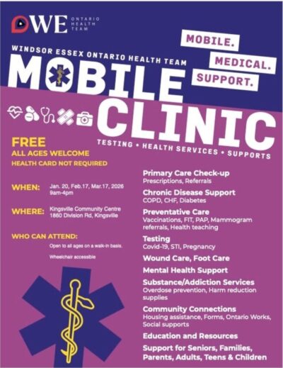 Mobile Medical Support (MMS) will be available on March 17, 2026, 9 am – 4 pm in the parking lot of Kingsville Community Centre at 1860 Division Rd N (across from Willow Tree Fruit market).