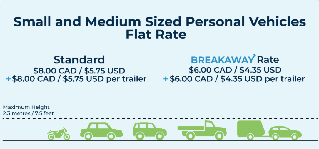 Passenger vehicles under 2.3 metres/7.5 feet in height will pay a standard rate of $8.00 CAD/$5.75 USD per crossing. While registered Breakaway members will pay a discounted rate of $6.00 CAD/$4.35 USD.