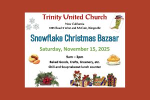 Events Trinity United Church Snowflake Christmas Bazaar, November 15 October 25, 2025 by Trinity United Church 0 comments Continue Reading →
