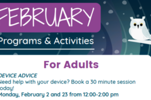 ADULT PROGRAMS & ACTIVITIES Device Advice Mondays, February 2 and 23 12 – 2 p.m. Need help with your device? Book a 30-minute session today! Crafting Hive Wednesdays, February 4 and 18 5:30 p.m. A Community Partner Program Write on Drop-ins Fridays, February 6, 13, 20 and 27 1 p.m. […]